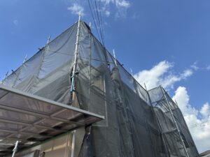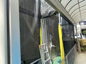 飛散防止養生シートの内側では、今、養生が行われているところです(‘ω’)