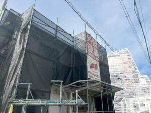 足場が組みあがって、飛散防止の養生シートを足場の周りにかけていきます。