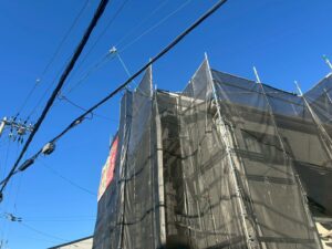 左側に飛散防止養生シート見えますがその前に施工していたI様邸です(#^^#)