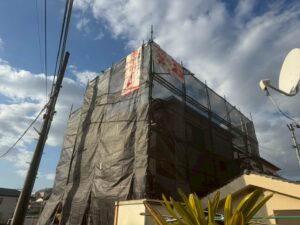 あとは飛散防止養生シートで囲い足場組は完了です(‘◇’)ゞ