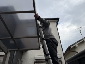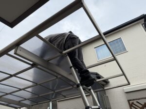 玄関前にカーポートがあり、このままでは正面の足場が組めない状態の時って、カーポートの屋根(ポリカ)を一旦取り外します。今回は奥の2枚取り外しました(*’ω’*)