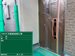 玄関って必ず通る場所ですが、玄関ドアも塗装しないので養生します。