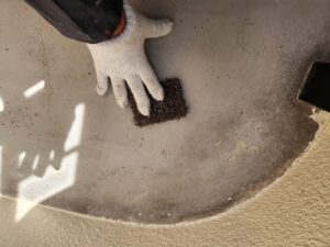ベランダの床面もまずはケレンから作業を行います。古い防水塗膜をゴシゴシ・・・。