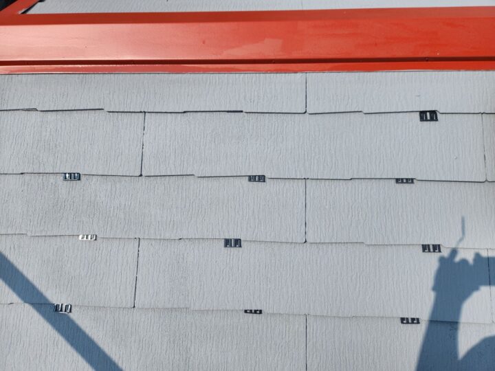 雨漏れや内部結露を防ぐために瓦と瓦の間にタスペーサーという部品を挿入します。屋根塗装工事 上塗り