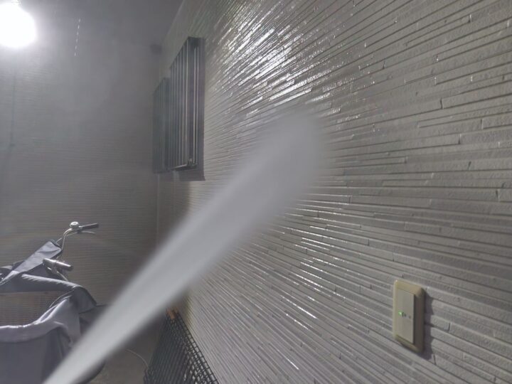 隙間から洗浄水が入らないように上から丁寧に洗っていきます。雨樋も高圧洗浄で汚れやホコリを流していきます。外壁塗装工事 高圧洗浄