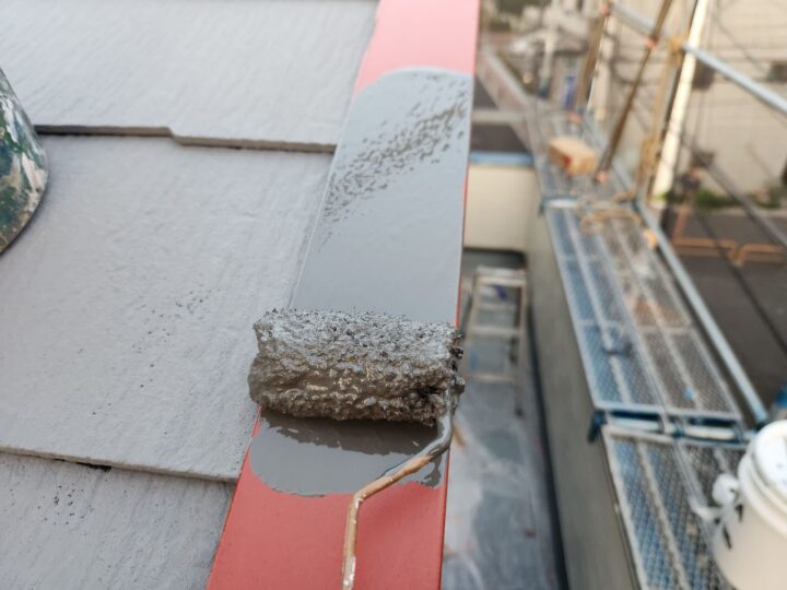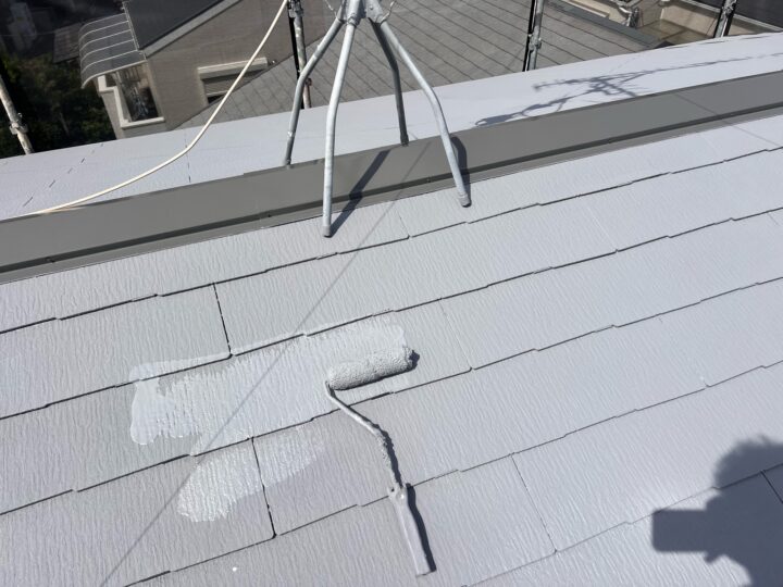 透明の下塗り材を使用しています。屋根塗装工事 中塗り