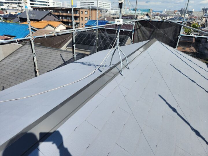 しっかりと色を付ける最初の大事な作業となります。屋根塗装工事 棟板金・ケラバ 上塗り1回目