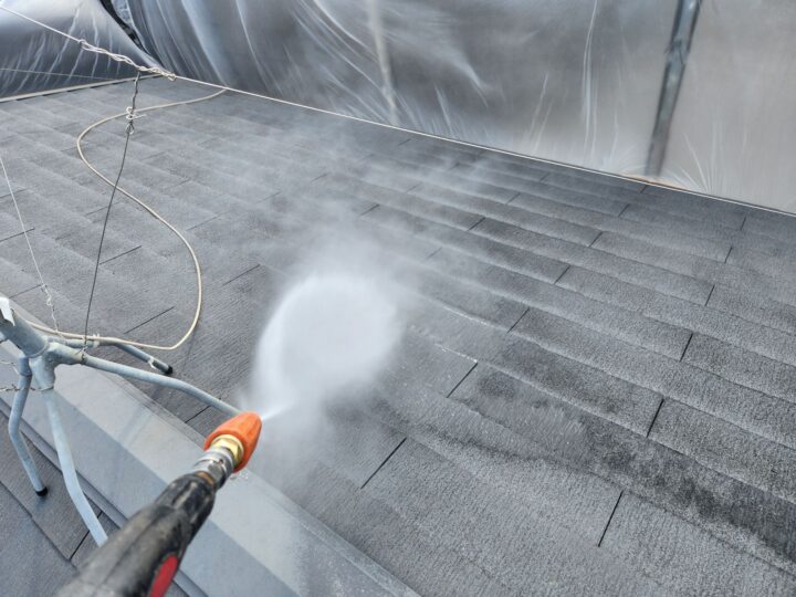 苔など付着した汚れを綺麗に洗浄していきます。屋根塗装工事 棟板金・ケラバ ケレン、錆止め