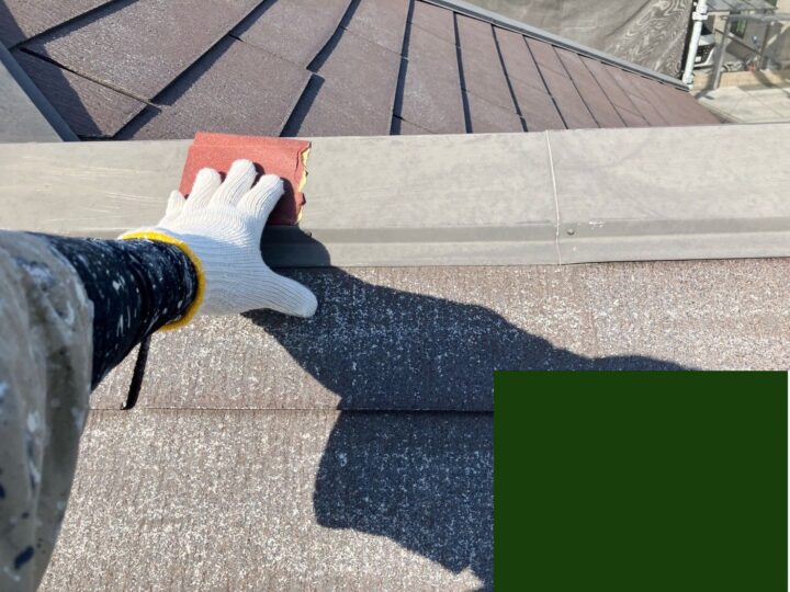 透明の下塗り材を使用しています。屋根塗装工事 棟板金 上塗り1回目
