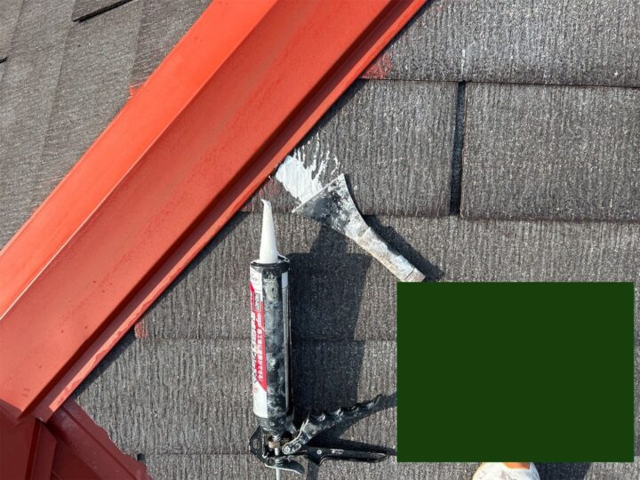 錆止めをしっかりと塗布して、鉄部に錆が発生しないように丁寧に塗り忘れなく塗布していきます。屋根塗装工事 屋根材補修