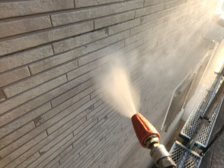 隙間から洗浄水が入らないように上から丁寧に洗っていきます。雨樋も高圧洗浄で汚れやホコリを流していきます。外壁塗装工事 高圧洗浄