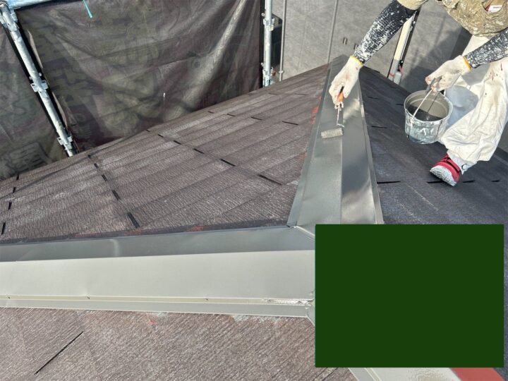 ムラの無いように丁寧に塗っていきます。屋根塗装工事 棟板金 上塗り2回目